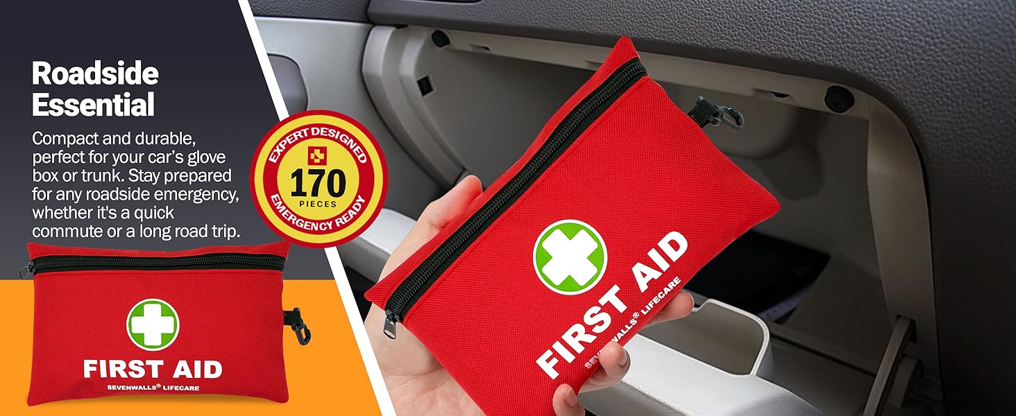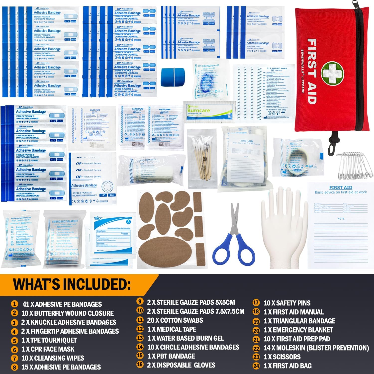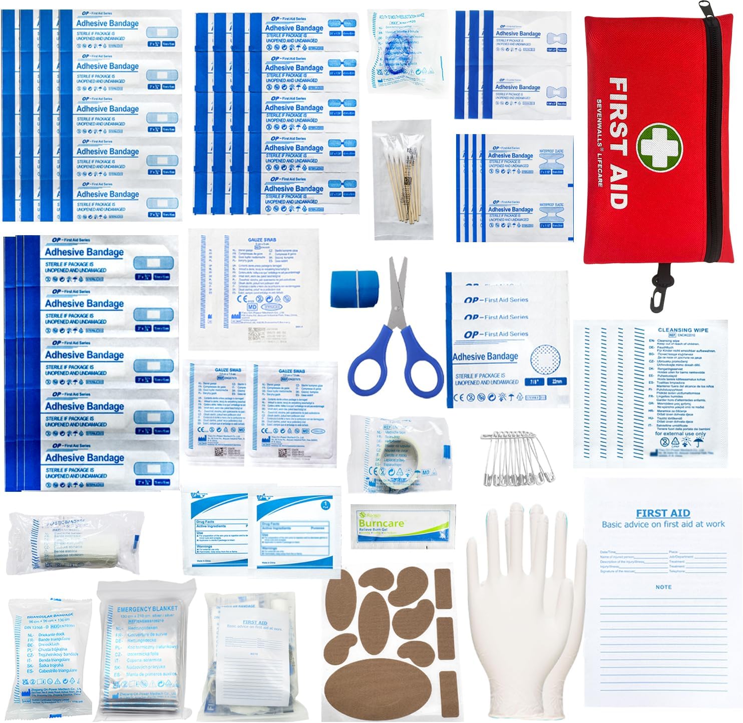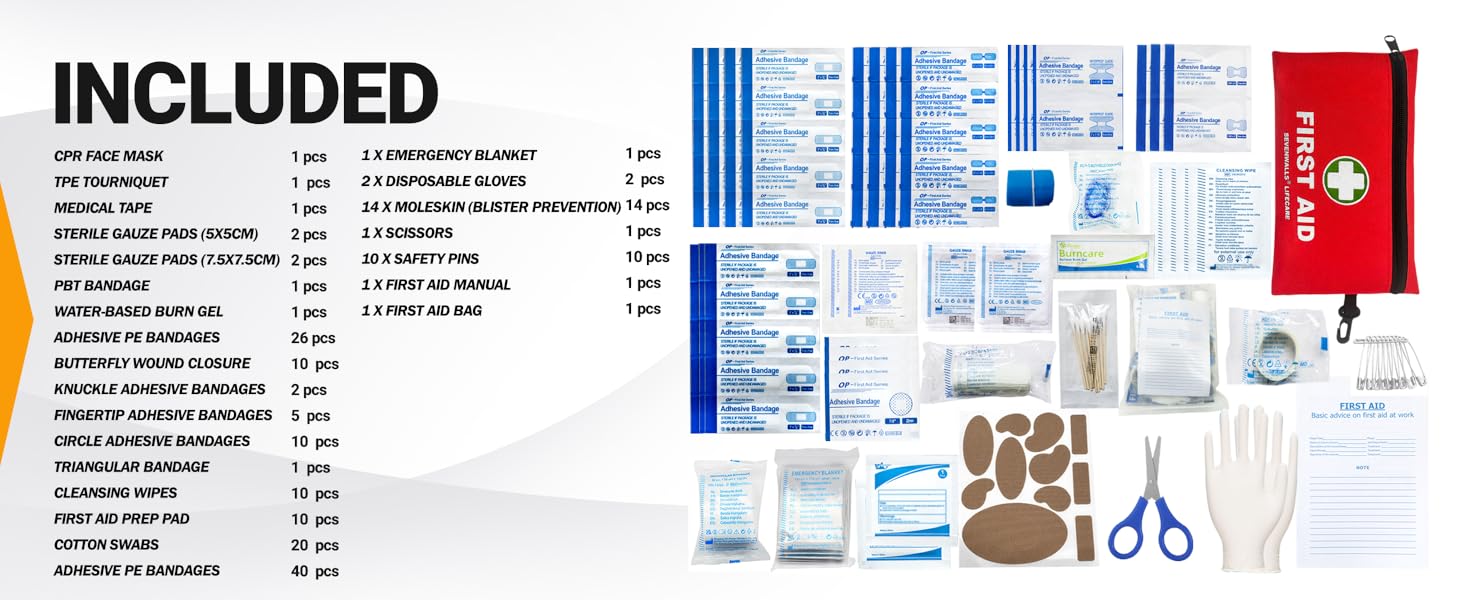 - COMPREHENSIVE 170-PIECE KIT: Includes a wide range of essential first aid items such as bandages, antiseptic wipes, adhesive tape, emergency blanket, plasters, scissors, and more. Be prepared for any minor emergency.